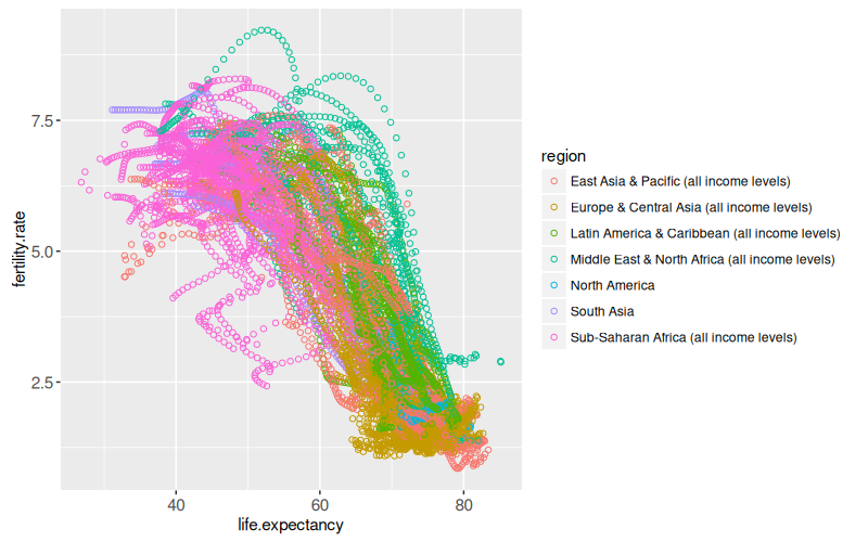 x=life.expectancy, y=fertility.rate, color=region,