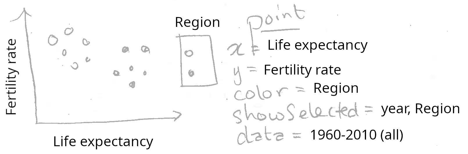 Each of the data visualizations sketched above has only one selection variable. However, a data visualization can have any number of selection variables. In the next section, we will explore a visualization of the World Bank data that has selection variables for region and year.