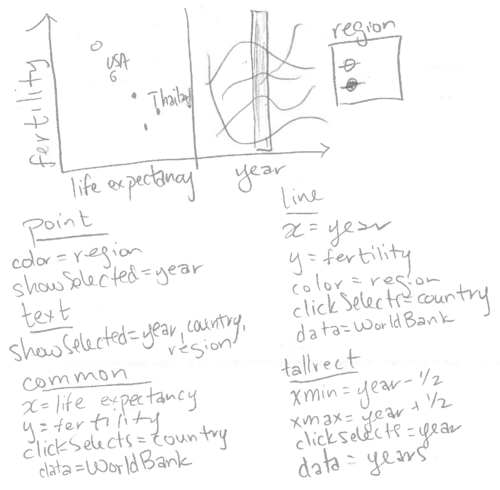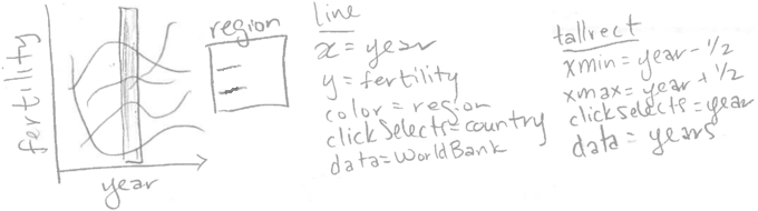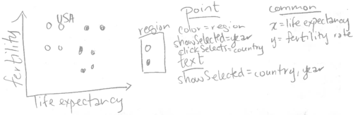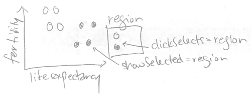 In this section, we will explain how the clickSelects keyword is implicitly used in interactive legends. If you have read the previous chapters, you have already implicitly used clickSelects, which was automatically created for the interactive legends in the previous chapters. For example, consider the sketch of the World Bank data viz from the last chapter.
