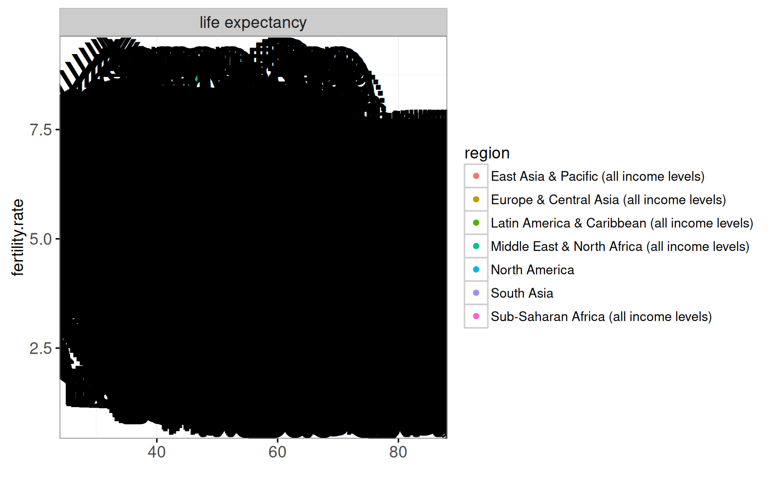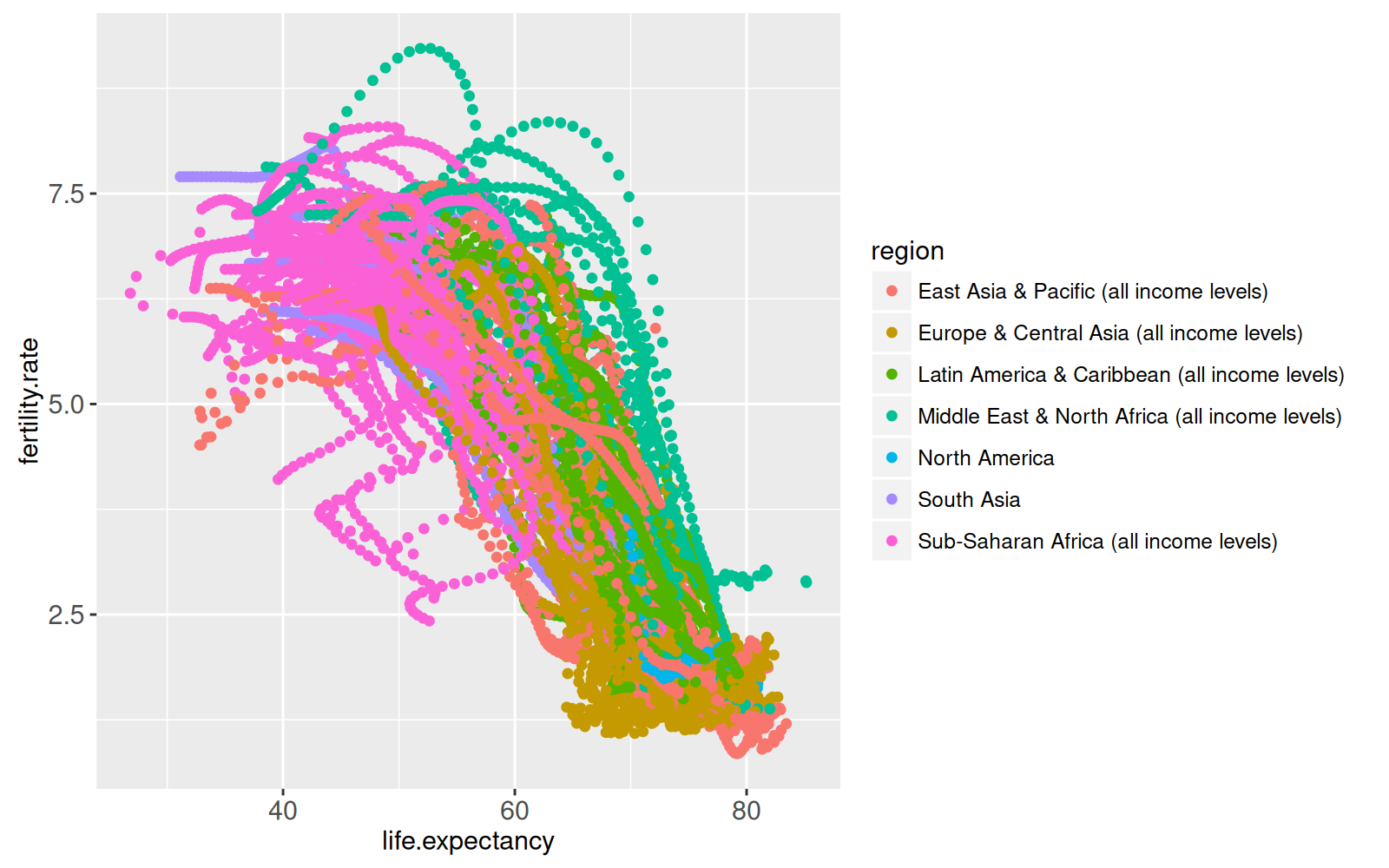 x=life.expectancy, y=fertility.rate, color=region,