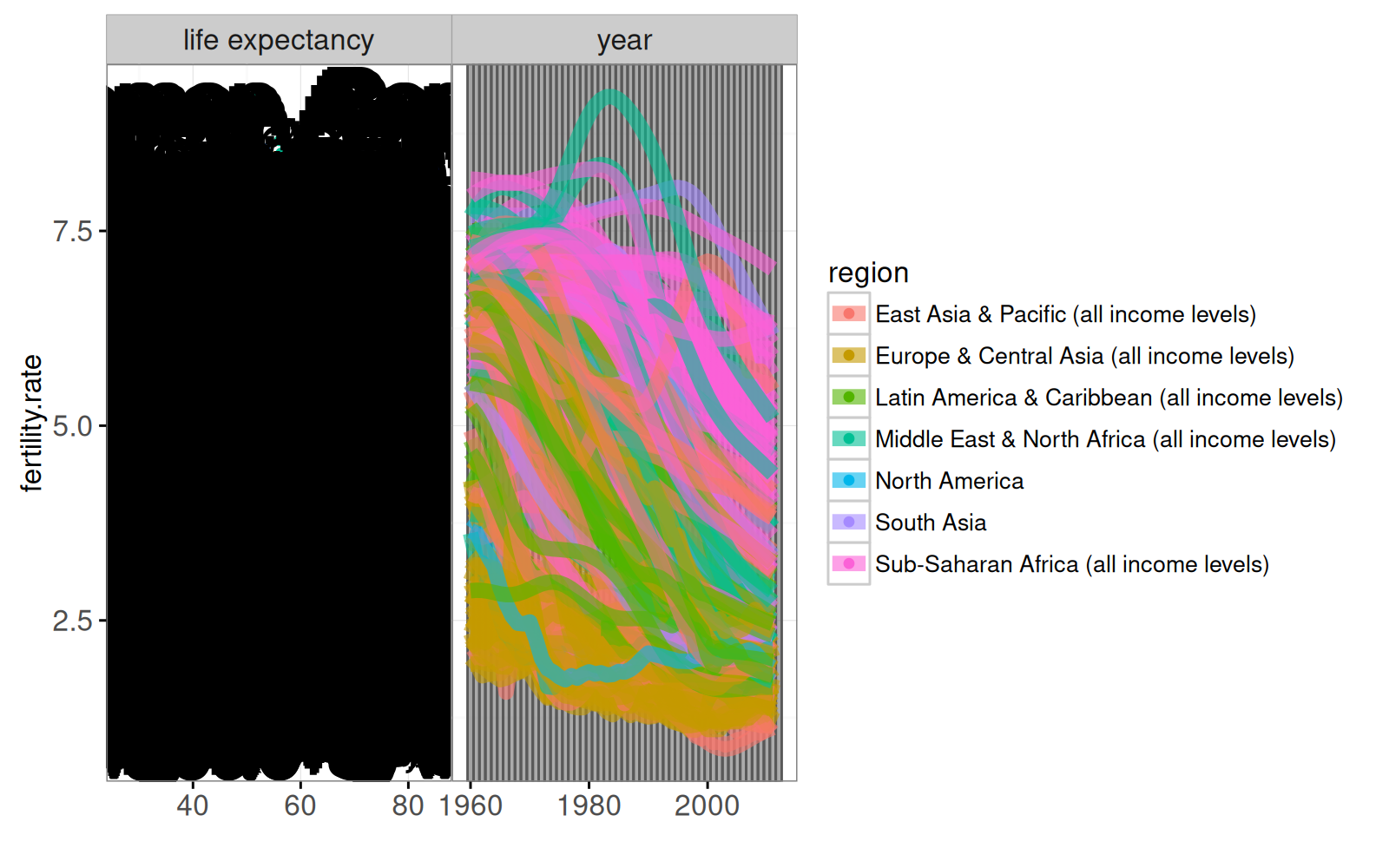 . Below, we add geoms for a time series plot that is aligned on the fertility rate axis.