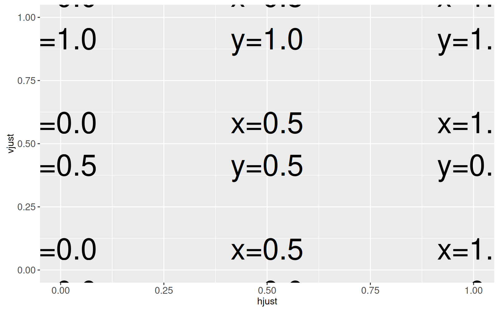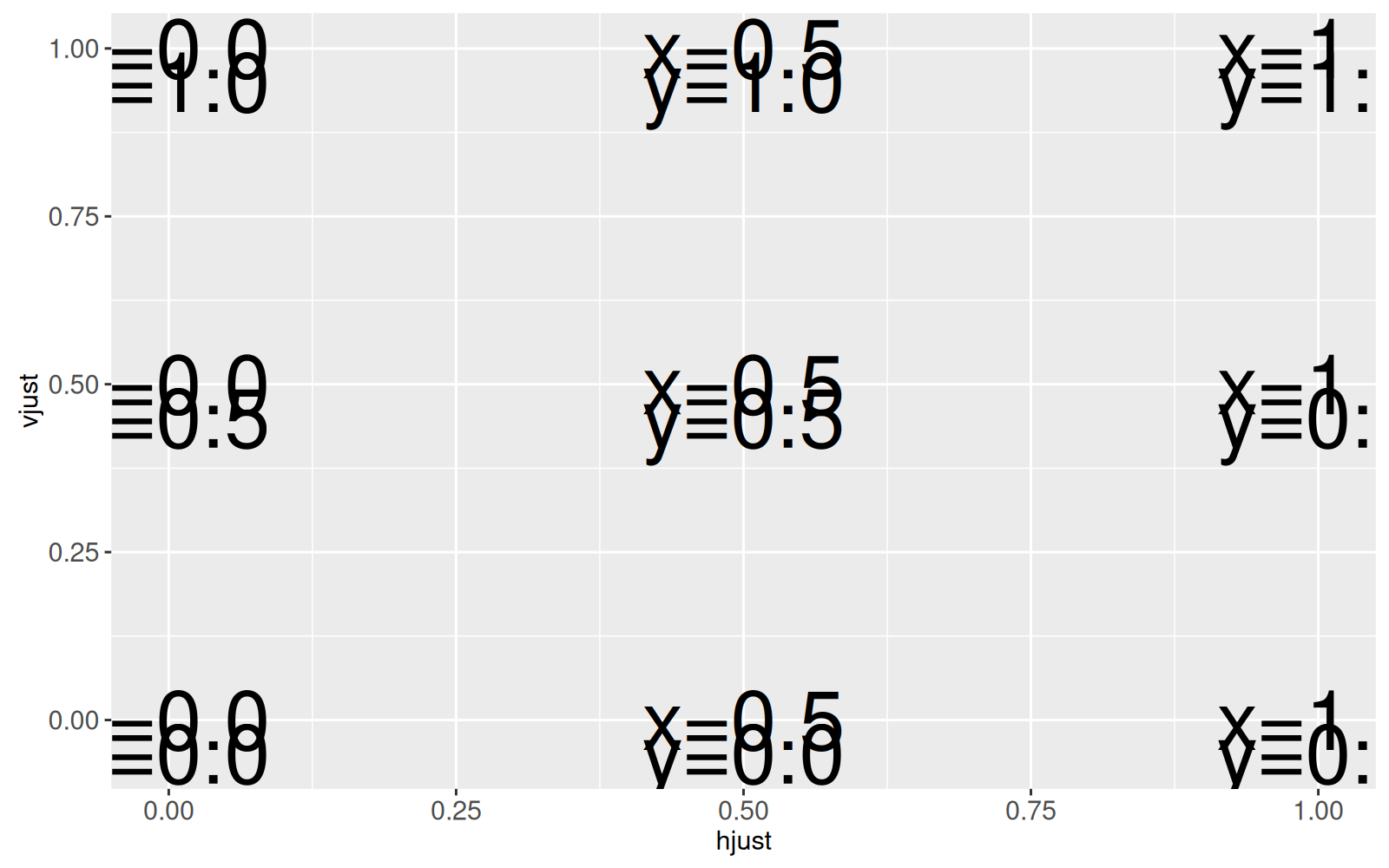 hjust, vjust, label=sprintf("x=%.1f\ny=%.1f", hjust, vjust)),