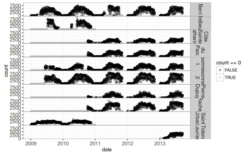 In the figure above, we clearly see the seasonal regularity (fewer bikers in winter). It is also easy to see the difference between zeros and missing values.