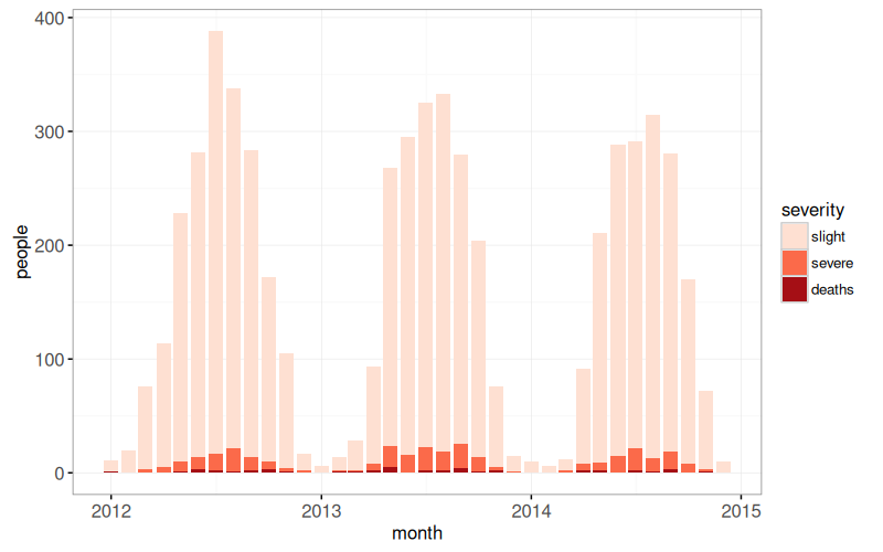 The result above shows one row per month, with different columns for each level of severity. We reshape those columns into long format using the code below.