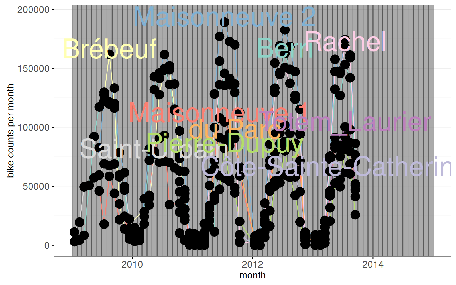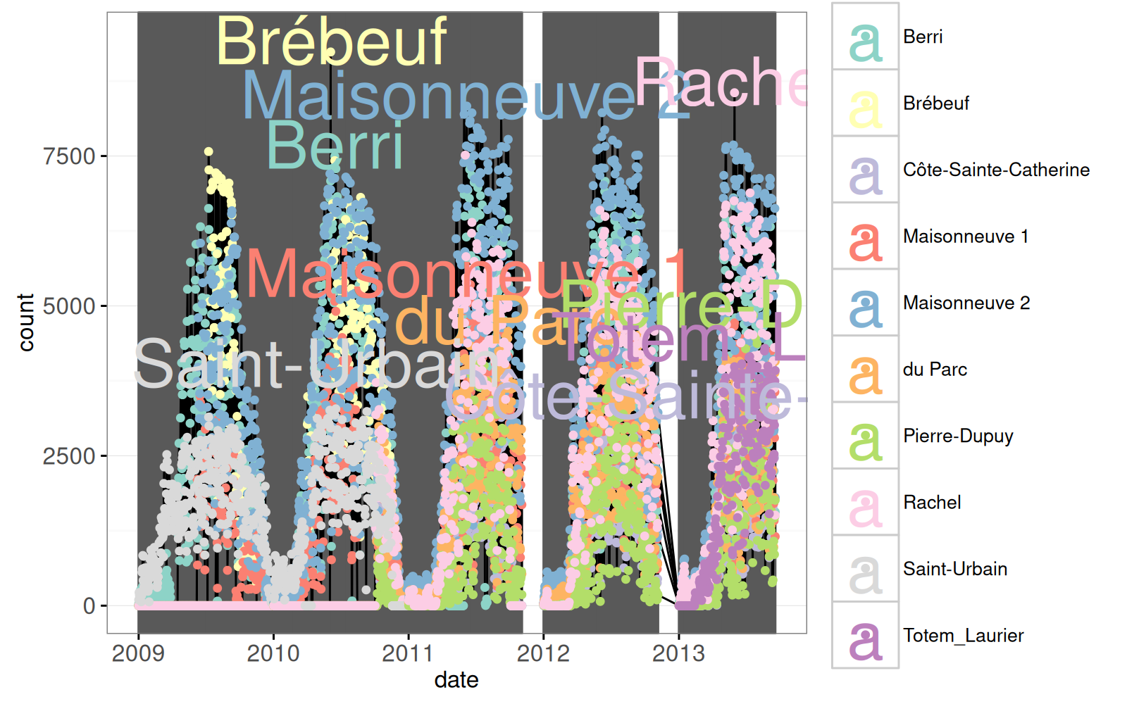 In this chapter we will explore several data visualizations of the Montreal bike data set.