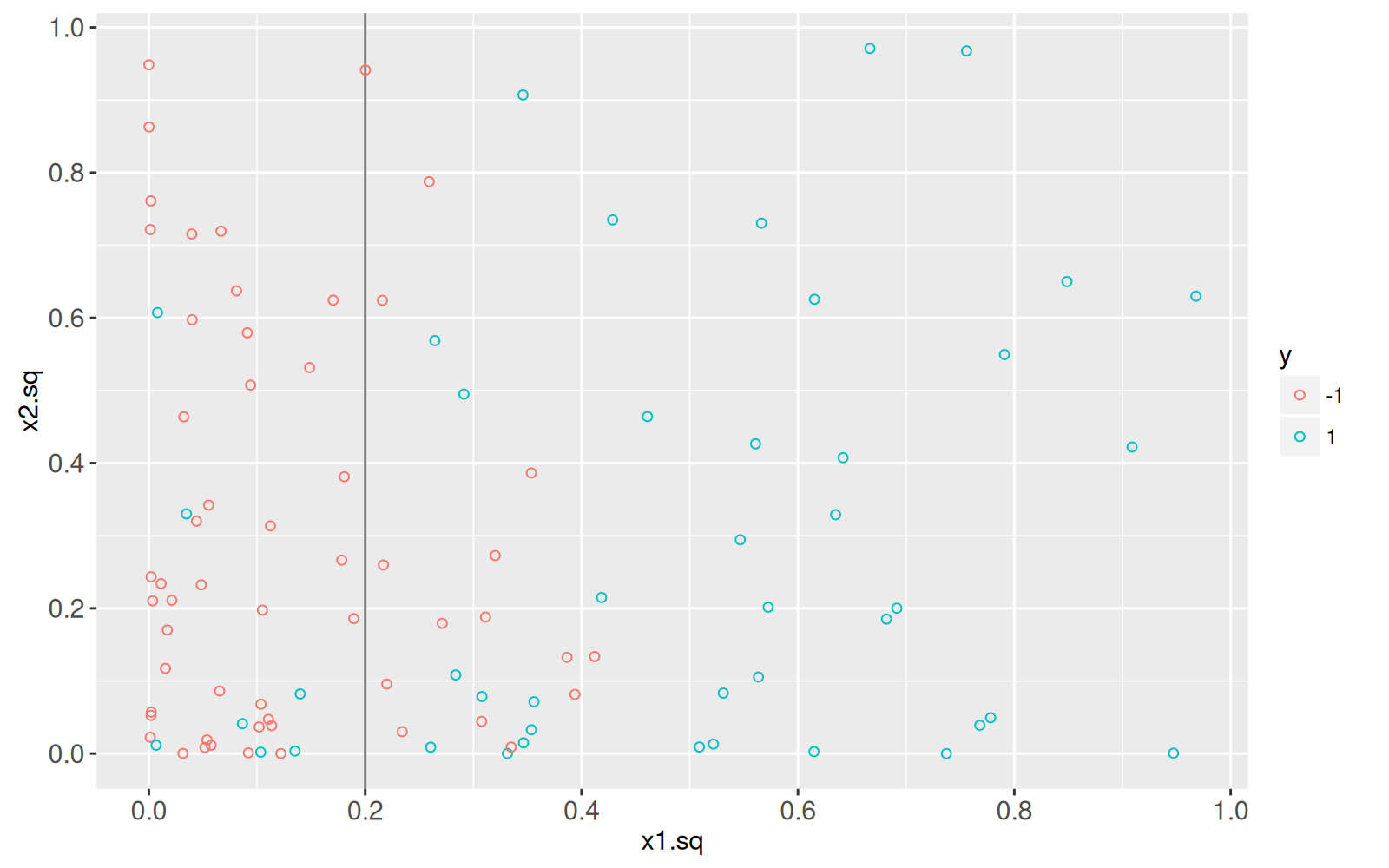 Next, we visualize the labels in the two-dimensional squared feature space. It is clear that the decision boundary is linear in this space.