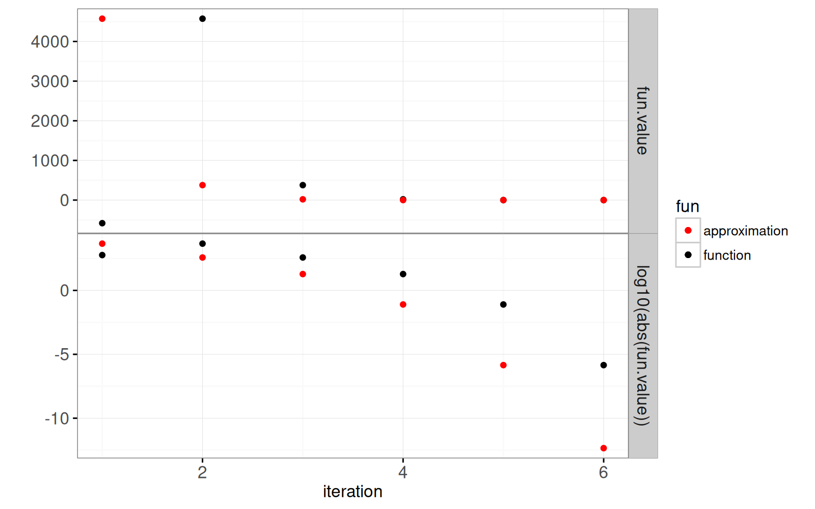 solution, y="log10(abs(fun.value))", fun="approximation"))+