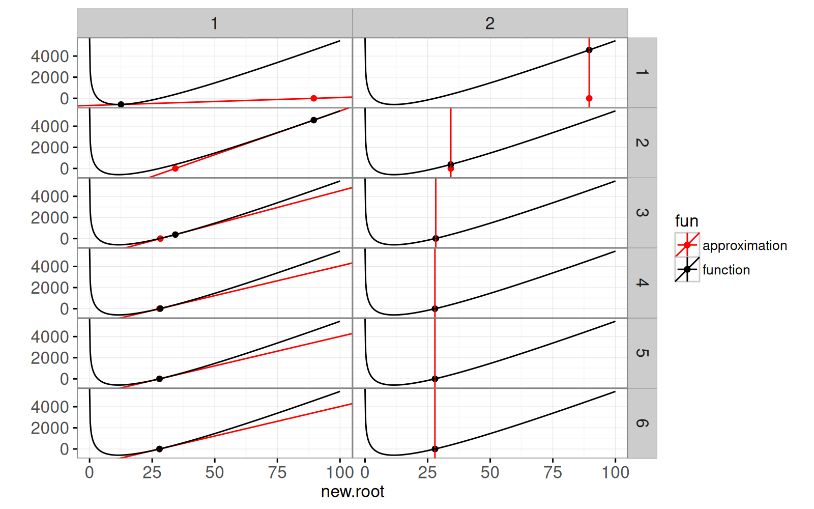 The plot below shows each step of the algorithm. The left panels show the linear approximation at the candidate root, along with the root of the linear approximation. The right panels show the root of the linear approximation, along with the corresponding function value (the new candidate root).