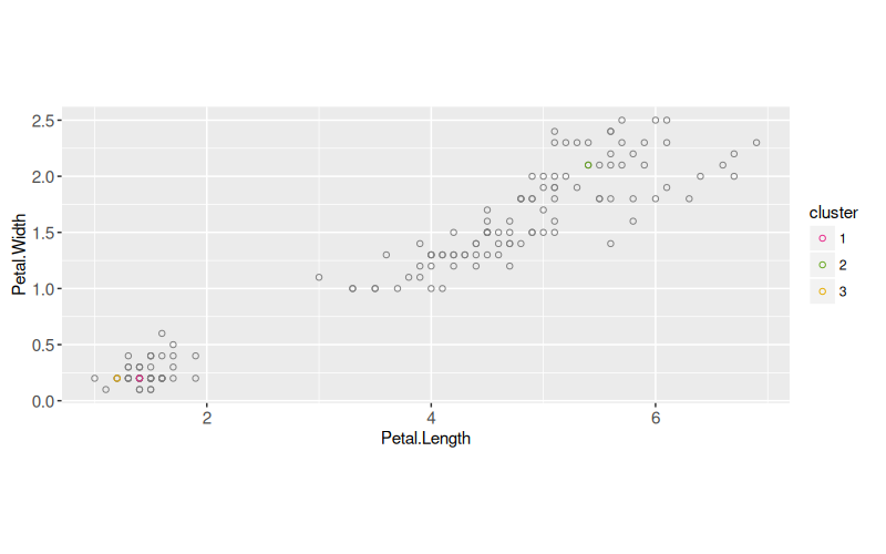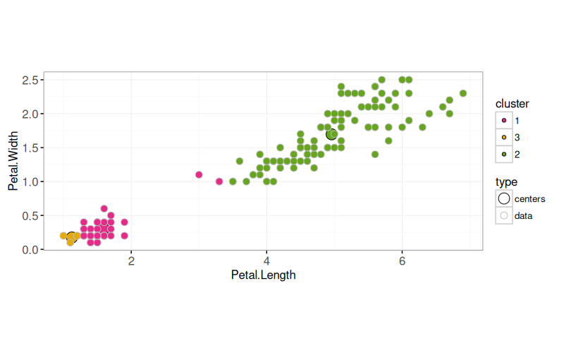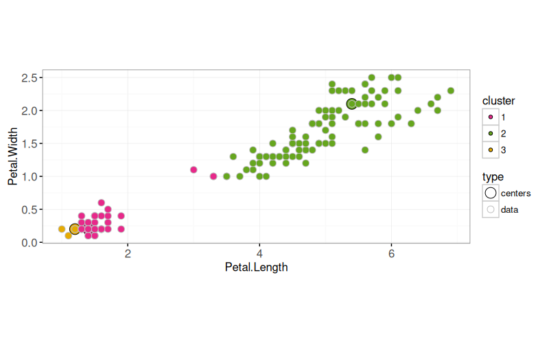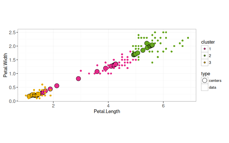 Petal.Length, Petal.Width, fill=cluster, size=type, color=type),