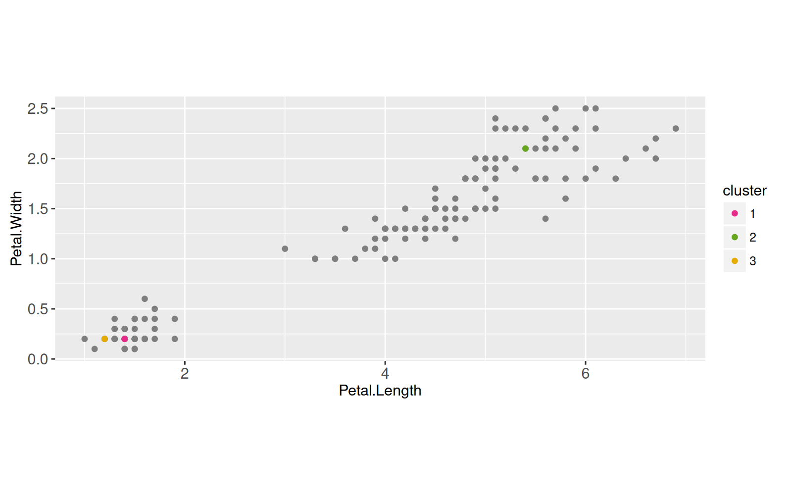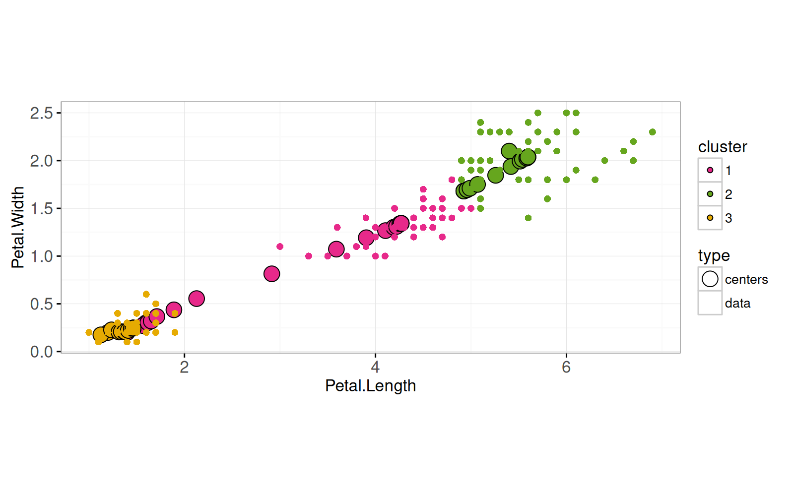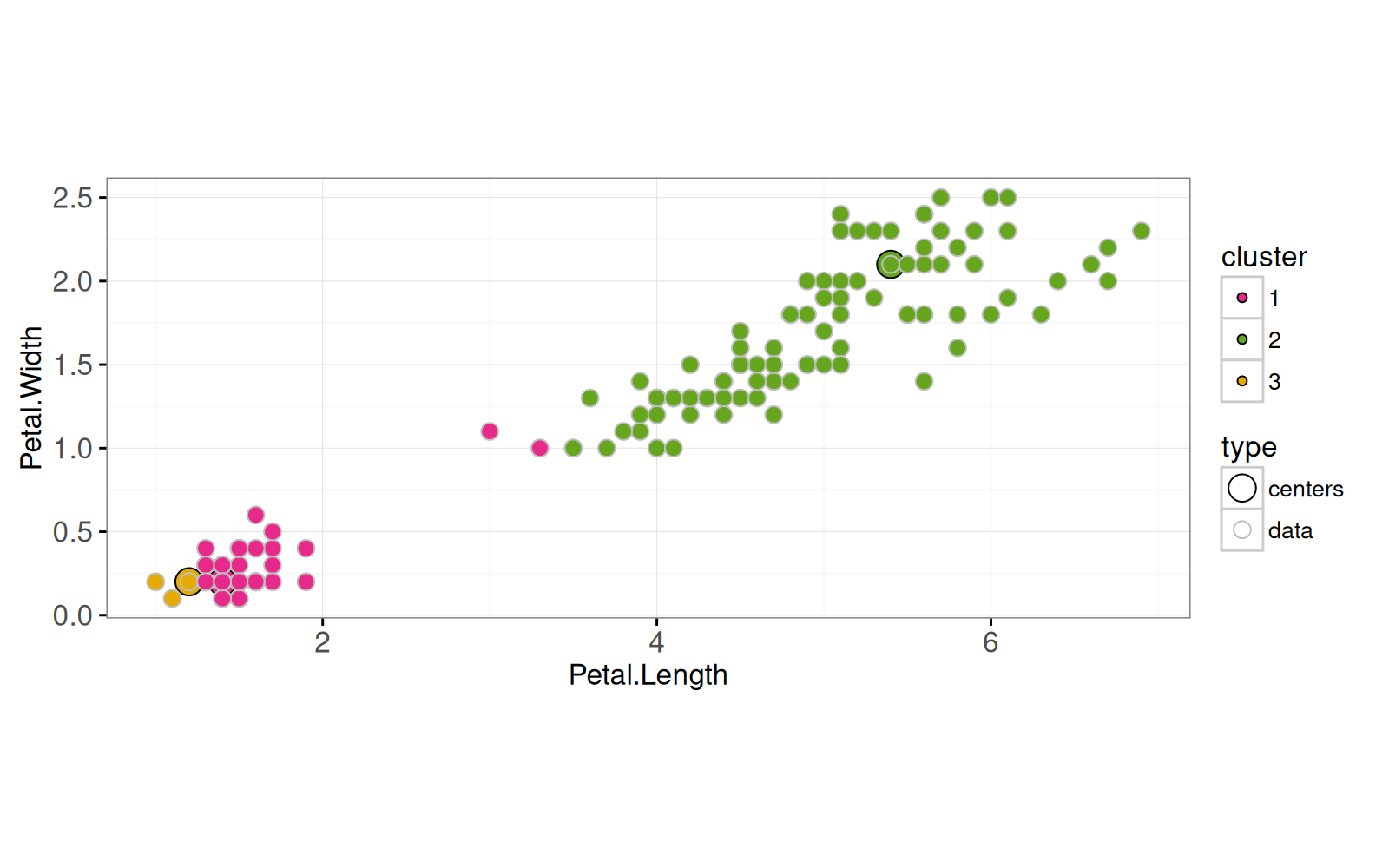 Above we displayed the two data sets (cluster centers and data) using two instances of geom_point