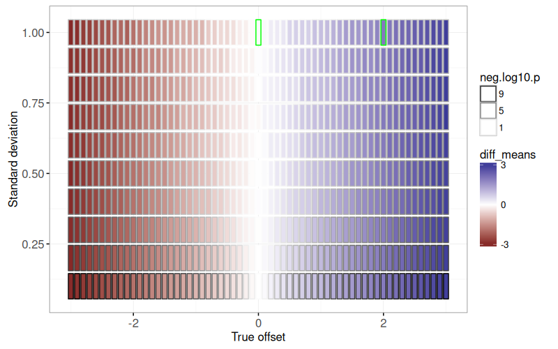* the estimated effect size (`fill=diff_means`) is consistent with the true offset (X axis).