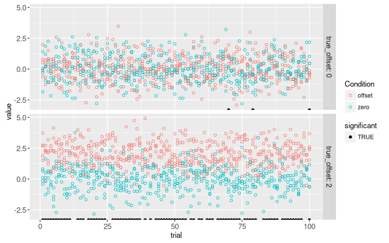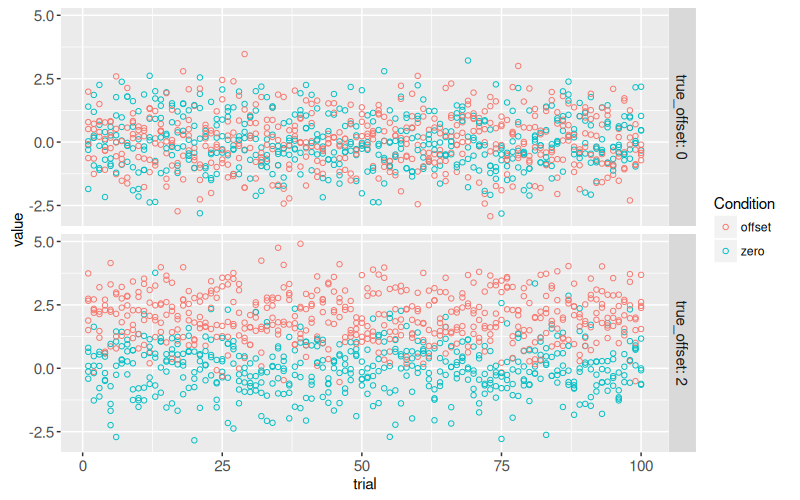 The X axis represents `trial`, which ranges from 1 to 100, each one with different random values simulated using the same assumptions (`true_offset=0` or `2`).
