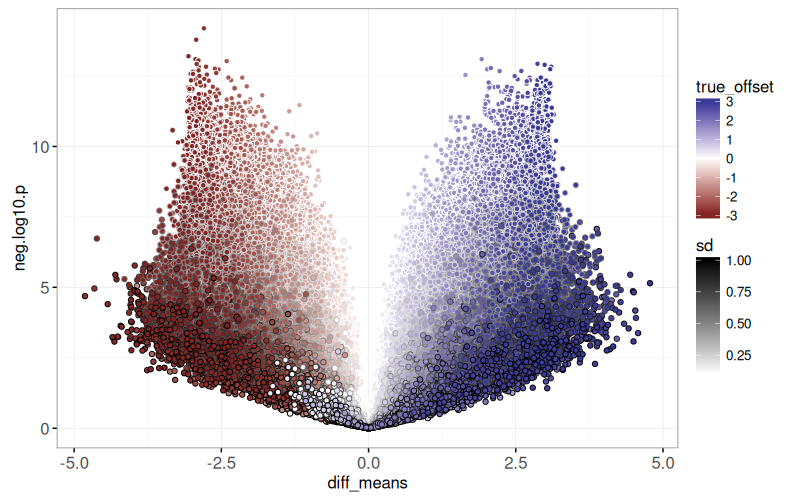 It also includes `fill=true_offset` and `color=sd` so we can see how the simulation parameters affect the volcano plot: