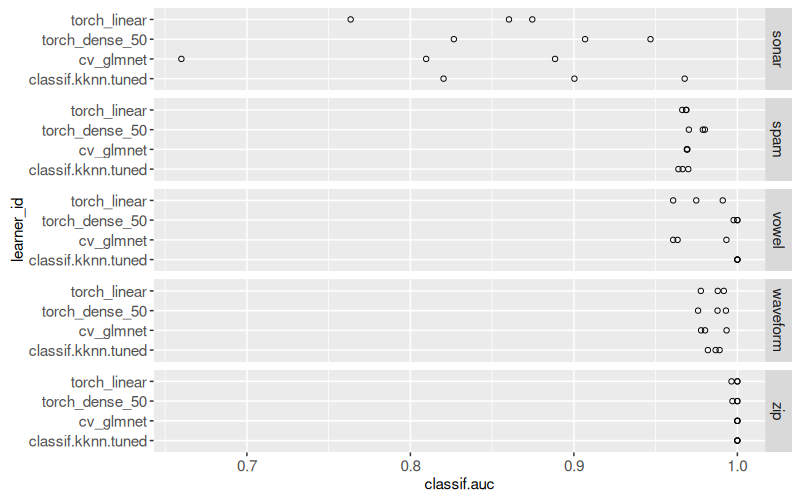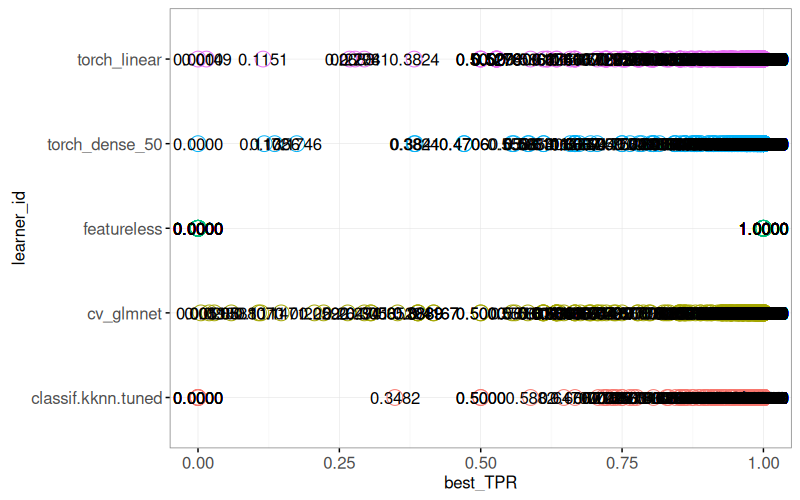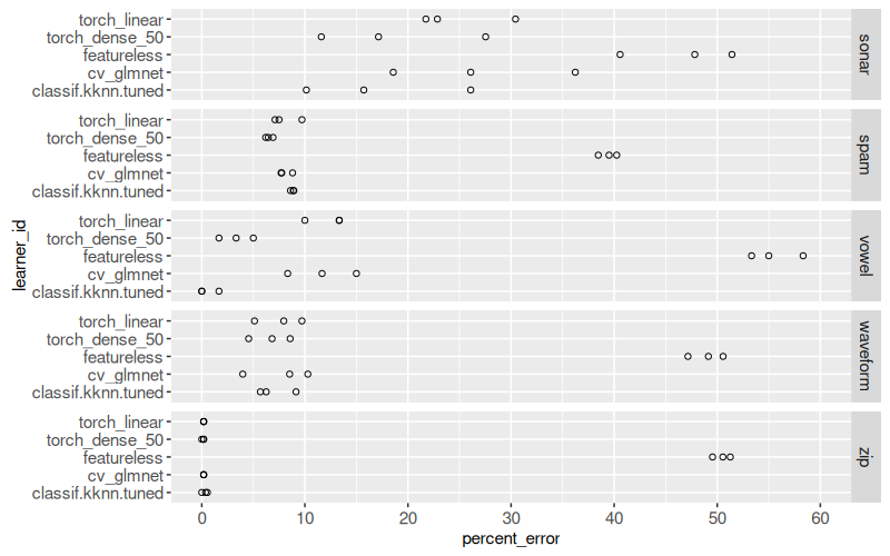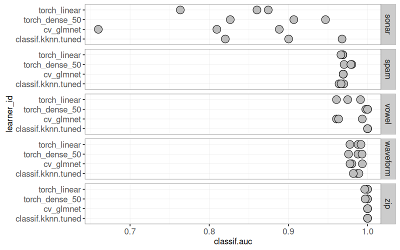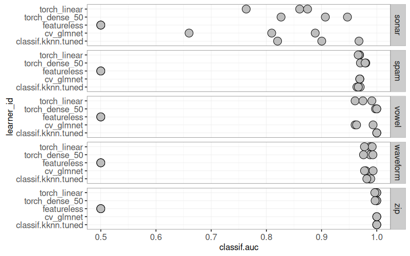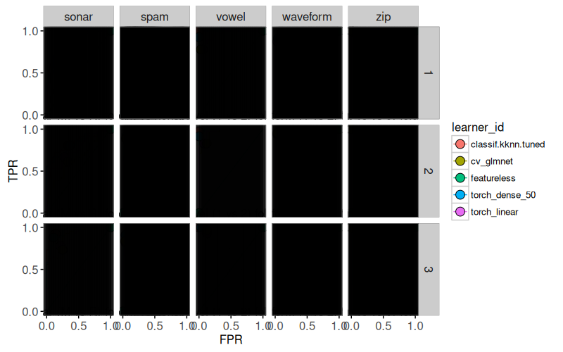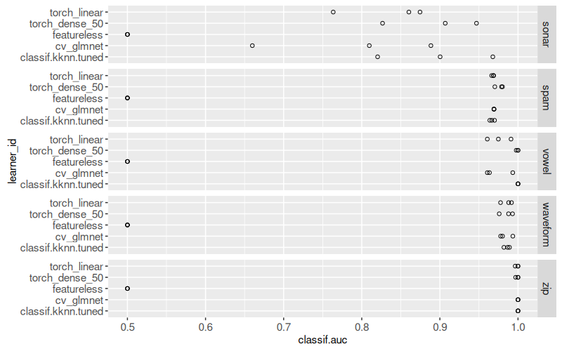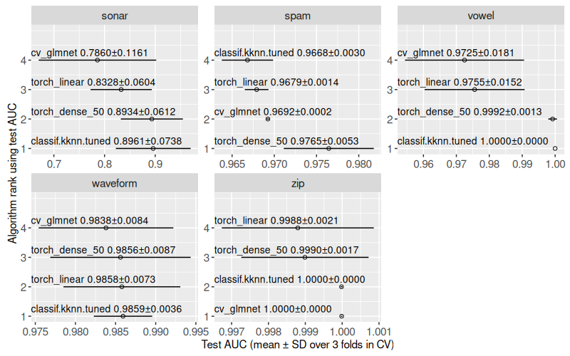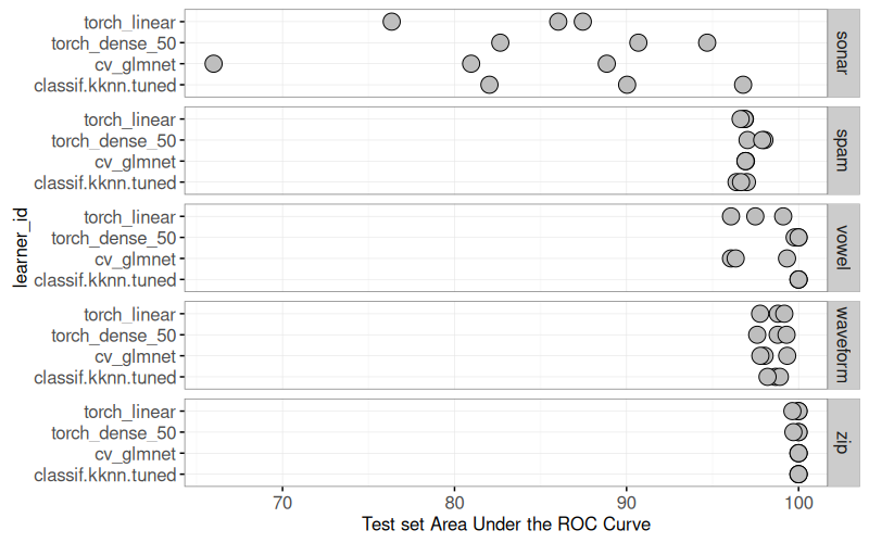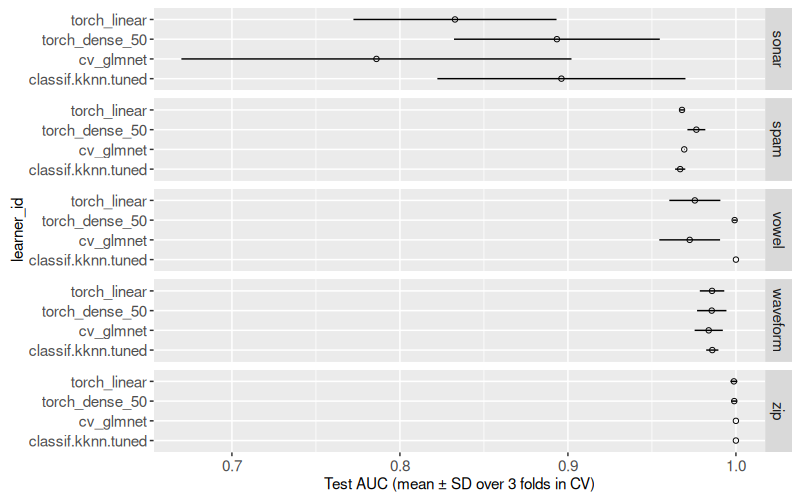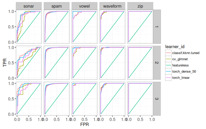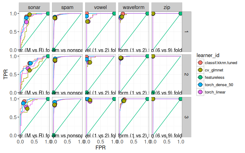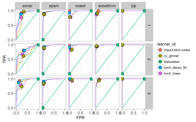 mlr3to define and execute a benchmark comparison using several binary classification problems, and several learning algorithms (nearest neighbors, linear model, neural networks). - We create various plots of test set error rates and Area Under the ROC curve.