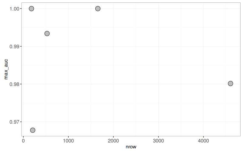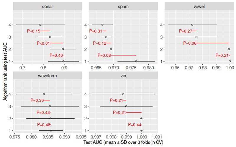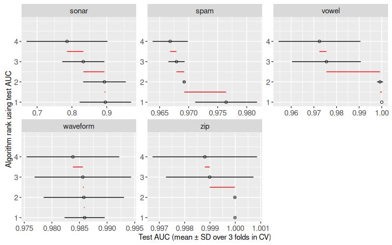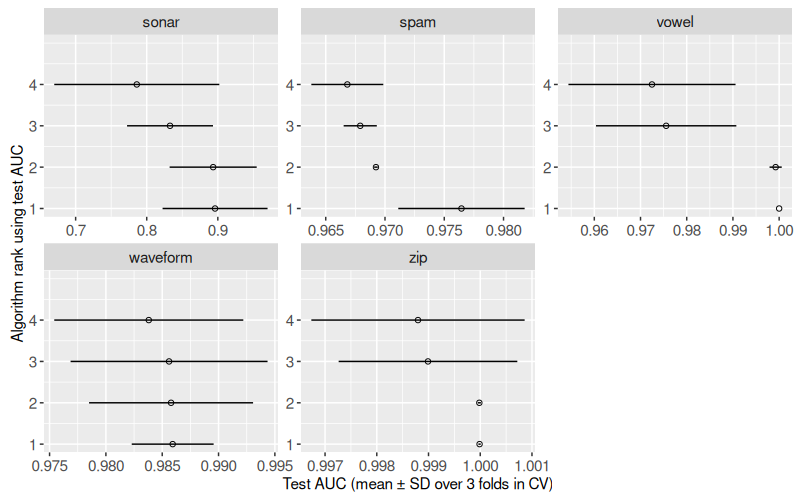 gg.summary, currently only the max AUC is shown. Addgeom_segment()that shows the variation in AUC among algorithms. - In