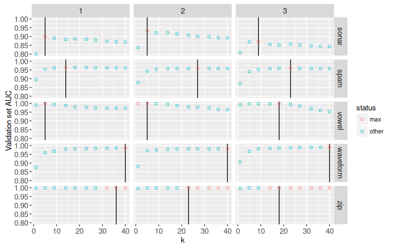 The visualization above has an additional plot on the bottom right, which shows details for the selected data set and cross-validation iteration. For an example of additional details shown using inverse AUC, try selecting one of the cross-validation iterations in the vowel data set.