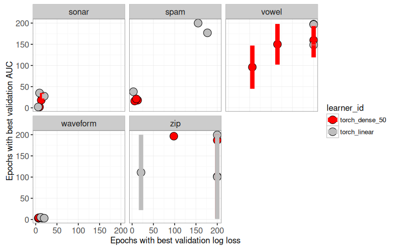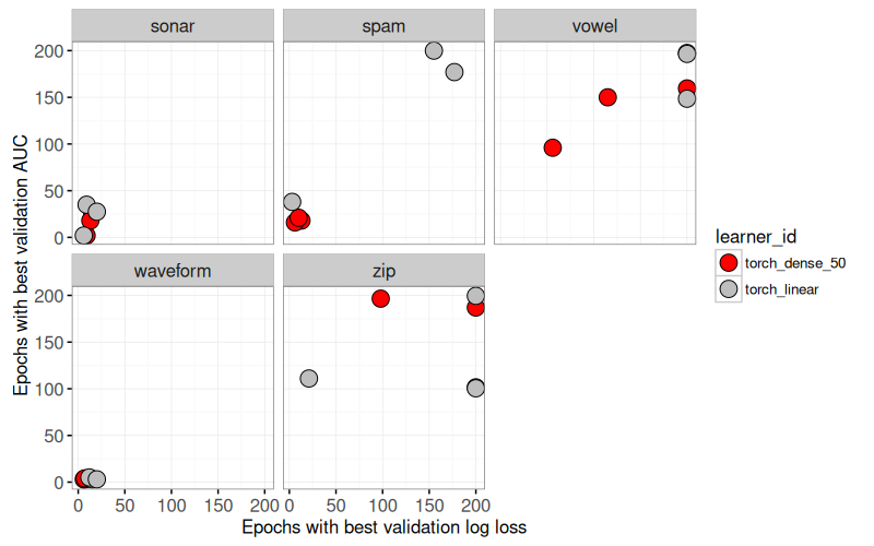 The table above has additional columns for min, max, and mid number of epochs which are best (according to validation log loss or AUC). We use the mid values as points in the overview plot below.