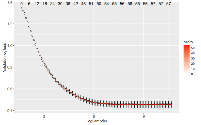 The plot above shows the validation set Binomial Deviance (same as log loss in previous section) as a function of the model complexity (measured by negative log penalty). We see the curve decrease, but not increase, which may indicate underfitting. To reproduce this plot, we use the ggplot code below.