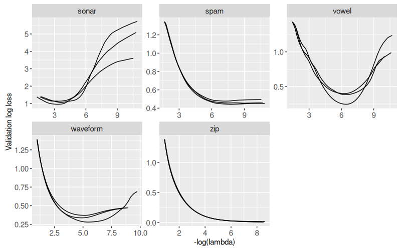 The table above contains one row per data set, cross-validation iteration, and regularization parameter. Below we display the validation log loss for each iteration as a different line, with each data set as a different panel.